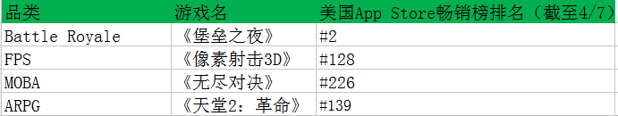 3、玩法:在西方市场,高操作性的游戏越来越受玩家欢迎。《无尽对决》《像素射击3D》《Zombie Hunter Frontier 3》时不时就会打入畅销前100-150名。目前,《堡垒之夜》是美国App Store最畅销的游戏。