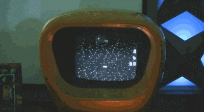 这是1962年,由麻省理工学院的学生斯蒂芬·罗素和他同学在早期计算机PDP-1上开发的游戏《Spacewar》,这是一款双人对战性质的游戏,两名玩家各自以杠杆及按钮操作一艘虚拟的太空船,在虚拟太空中互相发射鱼雷进行对战,直到消灭对方为止。现在我们把它称作“电子游戏”,但是在当时Video Game这个词都没有出现。