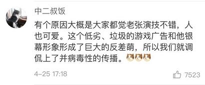 “有个原因大概是大家都觉老张演技不错,人也可爱。这个低劣、垃圾的游戏广告和他银幕形象形成了巨大的反差萌,所以我们就调侃上了并病毒性的传播。(网友@中二叔饭)”