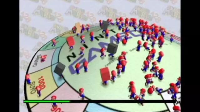事实上早在2000年,任天堂就展示过一个名为《超级马力欧128》的游戏Demo。里面展示了一个圆形平台,上面有128个马力欧,全部以独立活动的3D建模展示,还有一些用于展示物理效果的积木块。玩家可以控制下方的平台使它产生突起或者凹陷,或者让平台活动和摇晃,而平台上的马力欧的确就会对地貌的变化和平台的活动产生反应,比如一起滚到一个凹陷的地方,或者被弹来弹去。