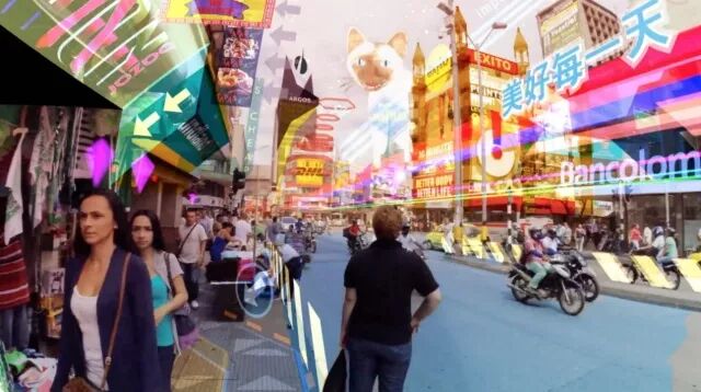 AR则可以为现实世界添上虚拟元素,再用统一界面呈现,我们可以理解为“活见鬼”。有了AR设备,我们可以凭空看到贫民窟挂着的霓虹灯,给小孩看他手里虚拟的布娃娃,在厨房失火时,快速在墙上调用数字消防步骤与逃生路线。