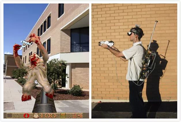 基于这个平台,老炮FPS《雷神之锤》就出了一个第三方扩展AR游戏,ARQuake。玩家得背着可穿戴背包,用只有两个按钮的“枪”,突突突射击在现实世界中出现的各种魔鬼。