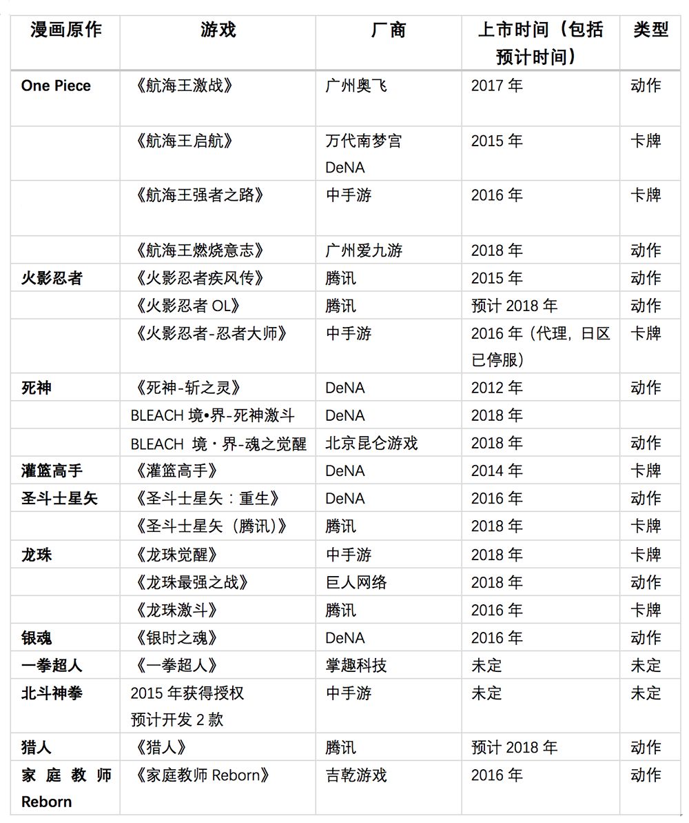 值得注意的是,这些游戏厂商获得授权的来源和方式都不尽相同。因此,尽管都是《周刊少年Jump》上的漫画作品,授权却可能来自集英社(《周刊少年Jump》所属的出版社)、动画制作公司(如东映)或者版权代理公司。也就是说,同一部原作的授权并不是唯一的,甚至可能不是独家的。