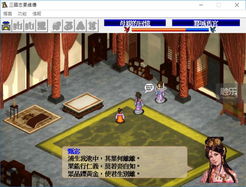 受限于游戏的系统和制作成本,《姜维传》的呈现形式很阳春:标题、场地、像素行走图、静态头像、对话框框一目三行;没有配音,没有特效。这是缺点,也是优点:它使编剧可以不用考虑“怎么念才自然”“这人物是不是真的会这样空口就把长长一整首诗念出来”这种问题,因为玩家是默认接受了这种最经济的表现方式,也接受这种读诗、作诗很平常的剧中世界的语境。