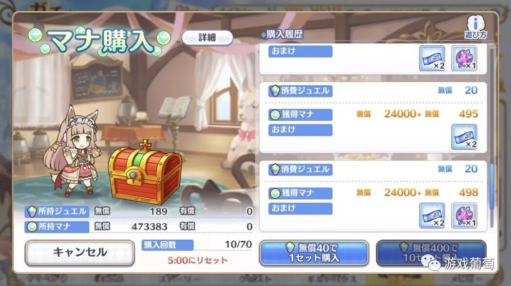 基于这些内容,游戏内最大的特点在于不吝啬给与玩家福利,比如送钻的量级非常大,足以让玩家在前期(葡萄君的实际体验是在50级之前)抽5次左右的十连。而按照现在体力购买加价的设定,在四次40钻换120体力之后,每次购买体力的投入都会低于合理的投入产出比。