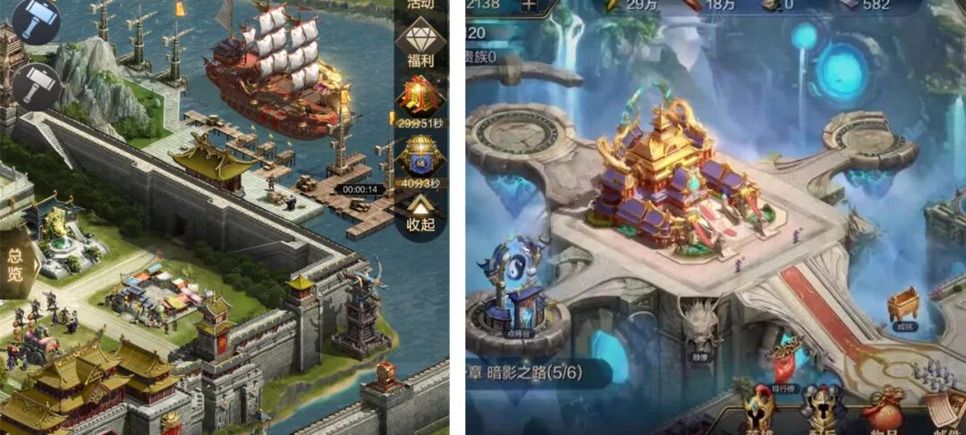而在美术UI上,《乱世王者》偏写实风格,极大程度的还原了符合现代人想象的古代城池模型,光影和文理极为细腻,建筑模型比例合理,一股浓浓的中国风。《我的王朝》选取了在年轻玩家中较为流行的潮流特性,动漫感更强,画面显得清新干净,色彩更鲜艳,偏向玄幻修真风格。