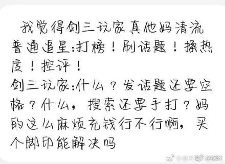 在互怼时,VK粉丝一方的有些人还在按娱乐圈粉丝的老套路来,将其当成明星粉丝之间的战争,结果意外地启发了剑三玩家: