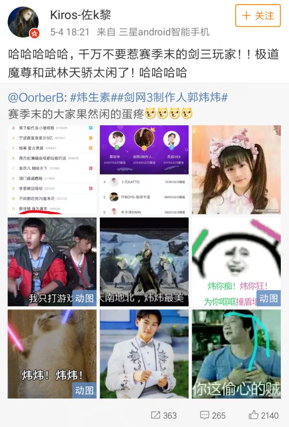 后来有人总结这次事件,说虽然这次的导火索是《何曾惧》的评论,但最终郭炜炜的“造星运动”能有这么大的流量基础和广泛的参与度,主要还是因为现在的时间节点正处在剑网3的赛季末,没有事干的大伙,实在是太闲了。
