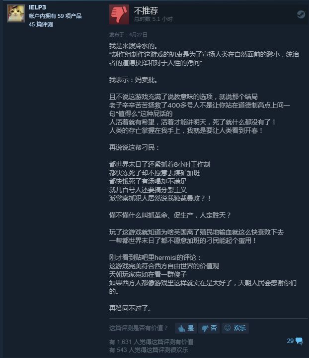 也有玩家说,“我玩一个游戏,目的是娱乐一下,而不是听制作组夹带私货的说教和道德批判,问题是现在2个小时已经过了,想退款也来不及了,简直是花钱找罪受!”