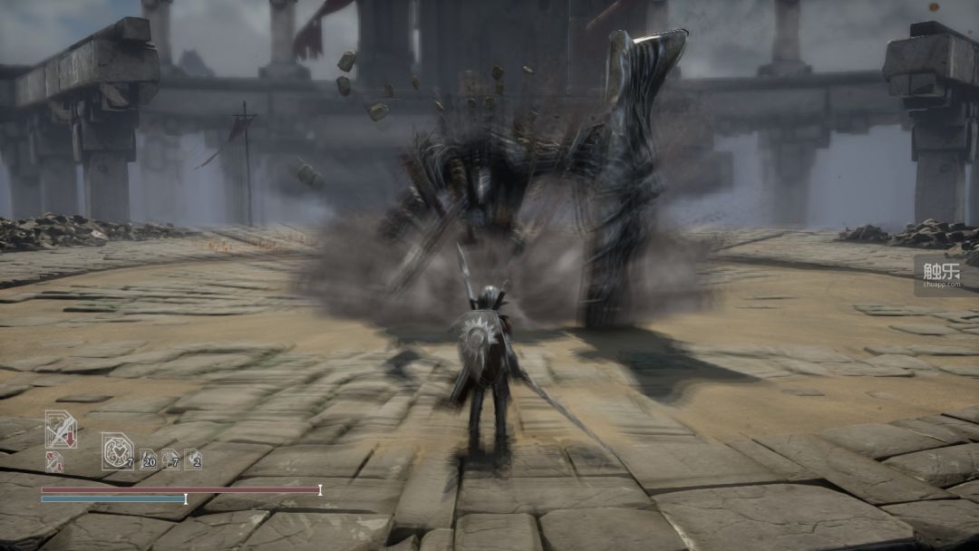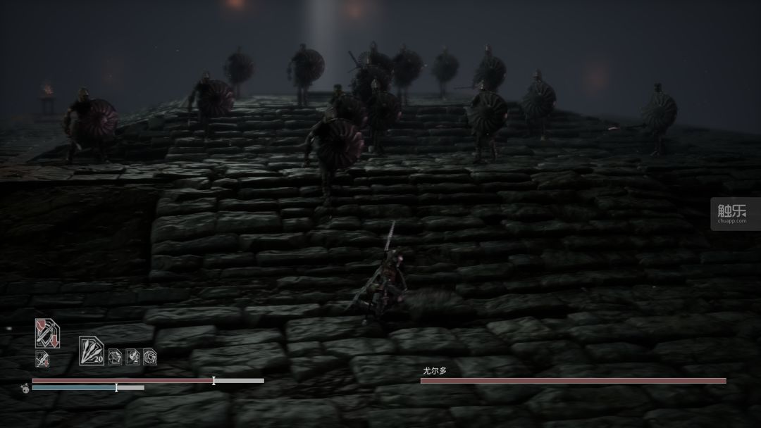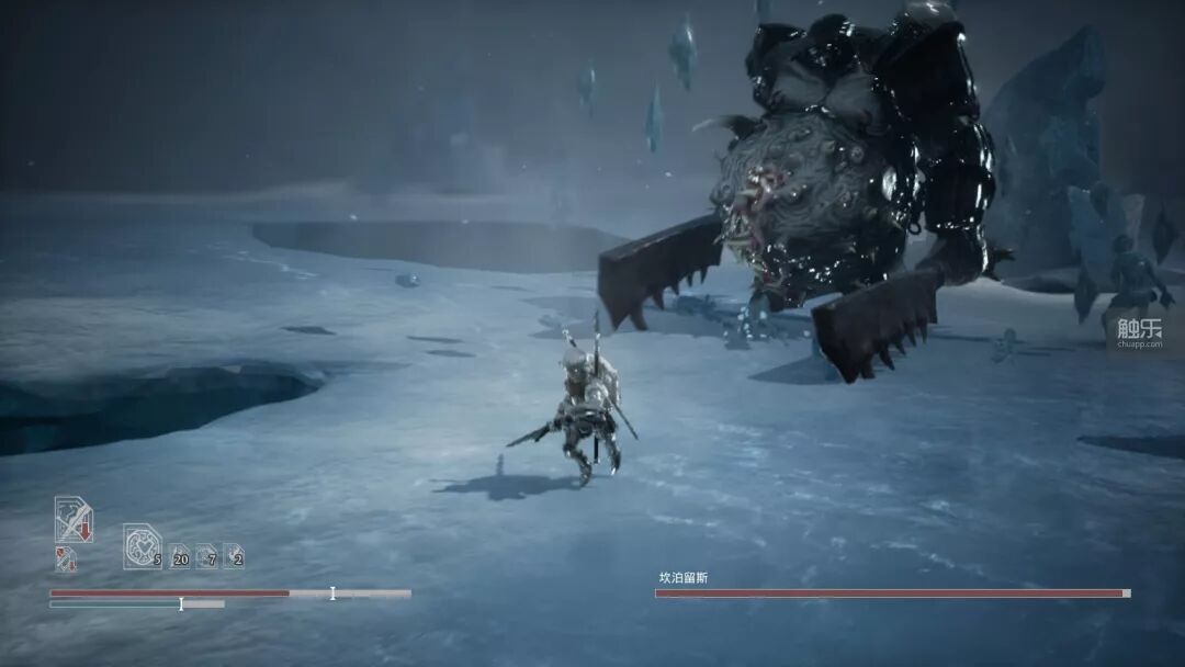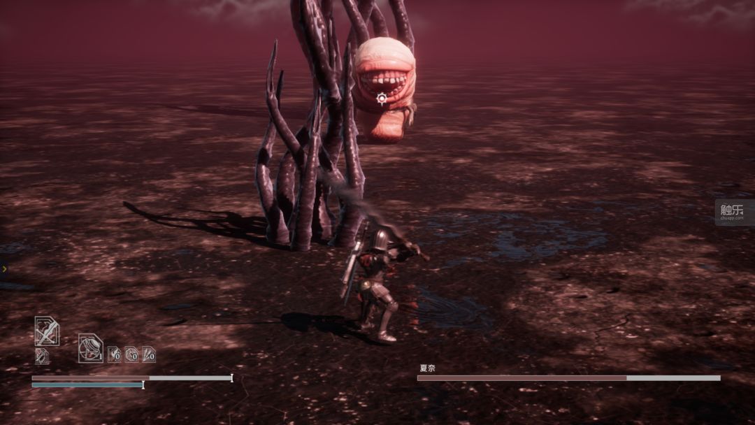 不过,有设计得好的怪物,自然也有设计得不好的怪物。在游戏中,我最讨厌的就是“暴食”和“怠惰”这两个Boss。暴食的缺点在于血量实在太多。堆血量提升难度,在任何游戏中都是相当有争议的设计,更不用说在《救赎之路》这样一款有技巧的动作游戏里。装备双手剑,攻击暴食一次后扣除的血量只有一丝(即为下图),这让我击败它的信念产生了动摇。