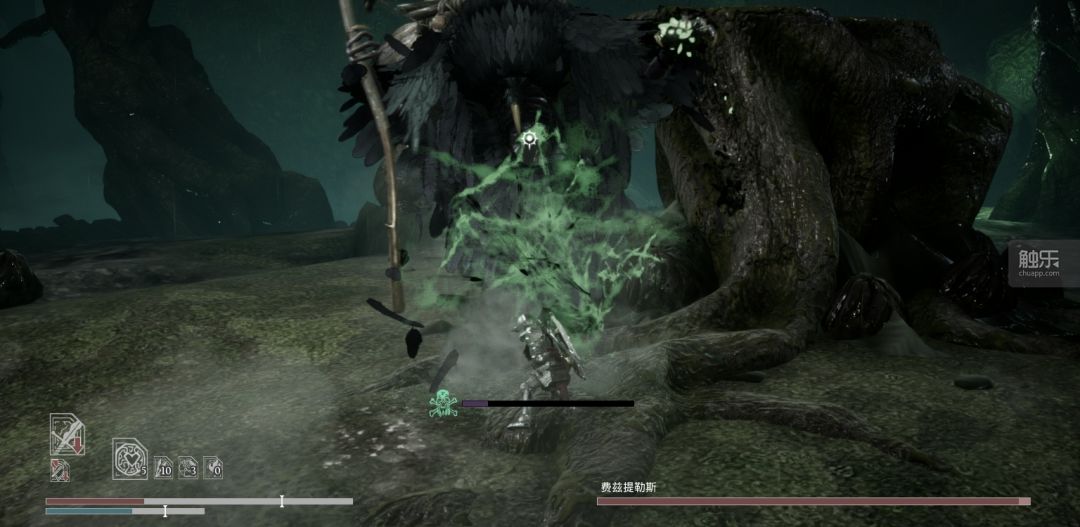 举例来说,游戏中的“贪婪”Boss,在属性设置上是“毒”,其所在的场景也有点像《黑暗之魂3》中的“法兰废墟”。很有趣的一点是,除了Boss技能召唤出的毒虫,以及自带毒属性的攻击之外,玩家在攻击它时,对方溅出的血也是带毒性的,算是从另一个角度为贪刀癌带来了新疗法。