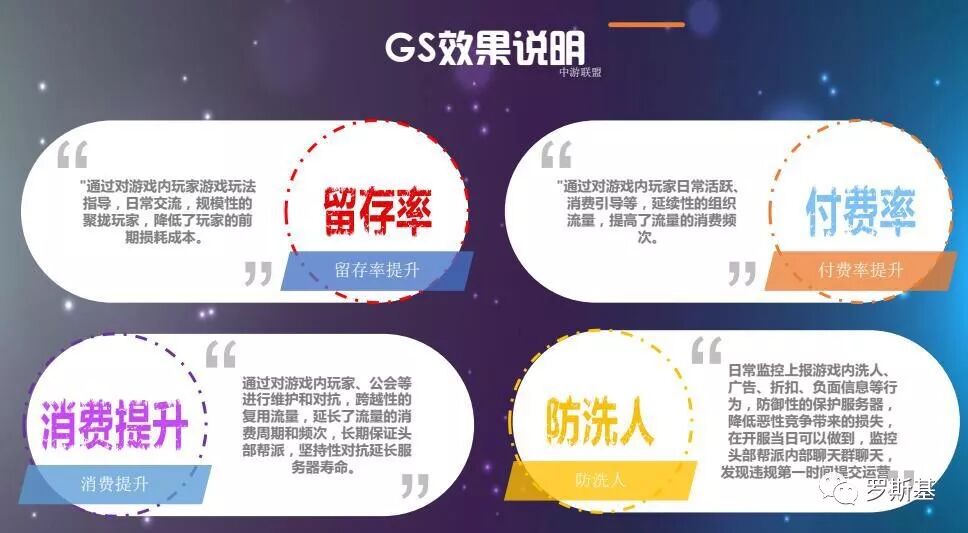 在分享PPT前,罗斯基想特别强调一下,GS是一把双刃剑,做好了行,做不好会有损失。其实GS维护在PC端游时代比较常见,而现在的手游公会代充业务不像以前有价值,必须考虑长线合作,他们自己想的也很明白。另一方面,发行利润薄,自己的买量成本高怕公会洗渠道用户。一些发行自己也在组建,但是又不想养成本,只能小规模尝试。最理想的还是双方有个互利互信的过程,要有数据指标考核,所以发行入股让利润并表,部分创始人套现得利,公会对发行游戏长期维护,至少闭环能形成。