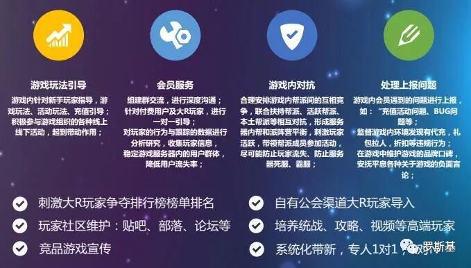 游戏运营建议、游戏/玩家事件管理、活动效果评估、营收拉升活动、游戏消费引导、付费玩家监控、流失玩家监控、游戏新人引导、游戏攻略指导、游戏聊天系统监控、游戏公会系统风控、公会对抗安排、制作良好消费环境、培养人际关系、排行榜对抗、充值活动竞争排名、BUG反馈、游戏建议测评、新版本测试跟进、游戏广告监控、其它游戏专服洗人监控、线下活动发布会跟进.......