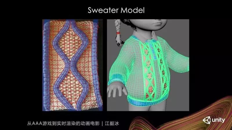 在不同的区域添加不同的纹理,这是其中一张贴图,这种贴图是非常小的,我们当时也没有太多测试,我使用的是256×256的大小。在此基础上加了很松散的发卡,使毛衣看很小更柔软,发卡是非常松散的,确定模型面数没有超标。