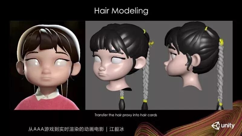 在处理人物头发等比较棘手的建模问题时,可以尝试用不透明的贴图来做头发的模型,再加入条纹来模拟发丝;可以把头发编成辫子来解决排序问题、把头发做成深色来规避阴影问题。
