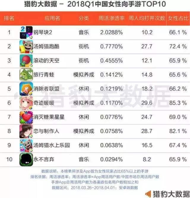 在刚刚过去的第一季度,猎豹大数据从女性玩家占比65%以上的手游中,筛选出了首份女性向手游榜单。