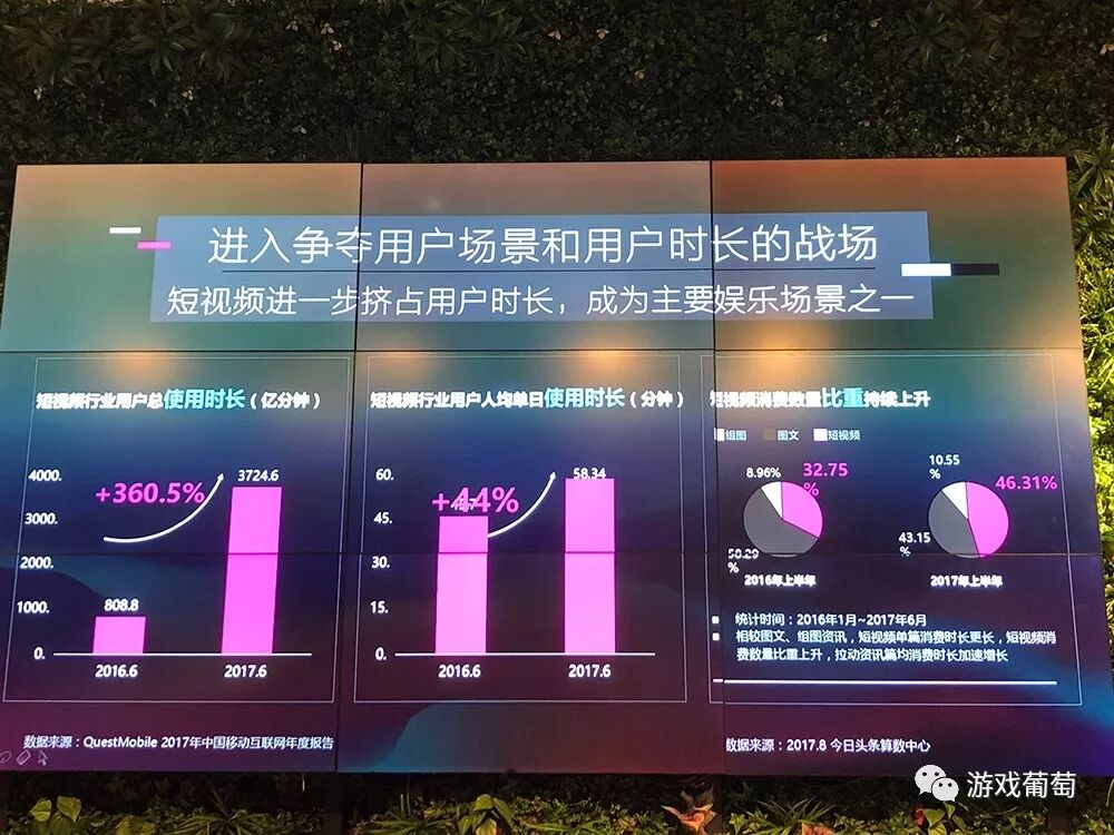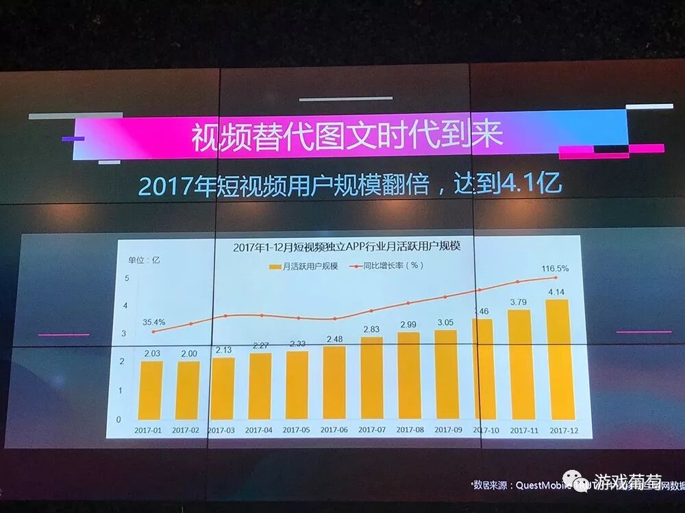如今视频替代图文的时代已经到来。下面两个数据比较旧,但可以反映出短视频一段时间以来的发展状况。一方面,2017年短视频用户规模翻倍,从年初2.03亿达到了年底4.14亿;另一方面,2017年12月份短视频DAU增至1.6亿,长视频为1.9亿,短视频正逼近长视频规模。