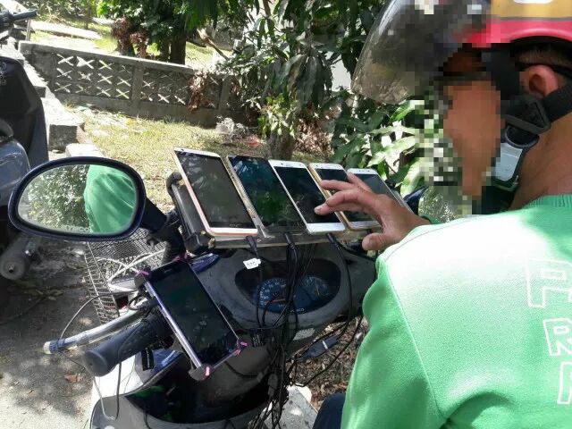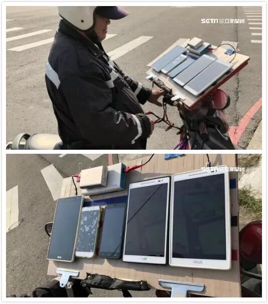 大爷在车头装上木板,把手机、平板一字排开,充电宝,至少两块,大平板,也有那么三块。
