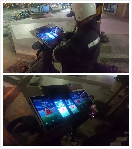 头发花白,皮鞋漆黑,踩着猩红的脚踏车,车头绑6台手机,每一台都用软管支架架住,连上数据线,屏幕上全部是《宝可梦GO》。