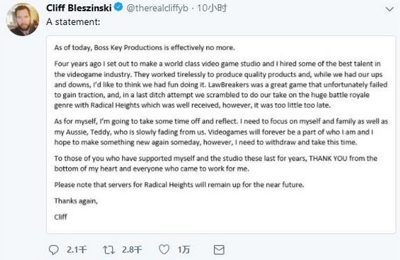 Epic公司的前明星制作人,被称为《战争机器》之父的Cliff Bleszinski在四年前建立了Boss Key工作室。由于公司推出的两款作品接连失败,团队无法继续维持,Cliff 5月14日宣布工作室就此解散。