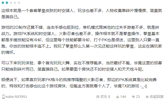 但在稍显“挑剔”的TapTap平台上,《拳皇命运》的高评分却没有延续下来,在超过490个玩家评价中仅获得2.8分(满分10分),评论区中充斥着玩家对玩法模式的不满,以及对一个经典IP无法十足还原的叹息。