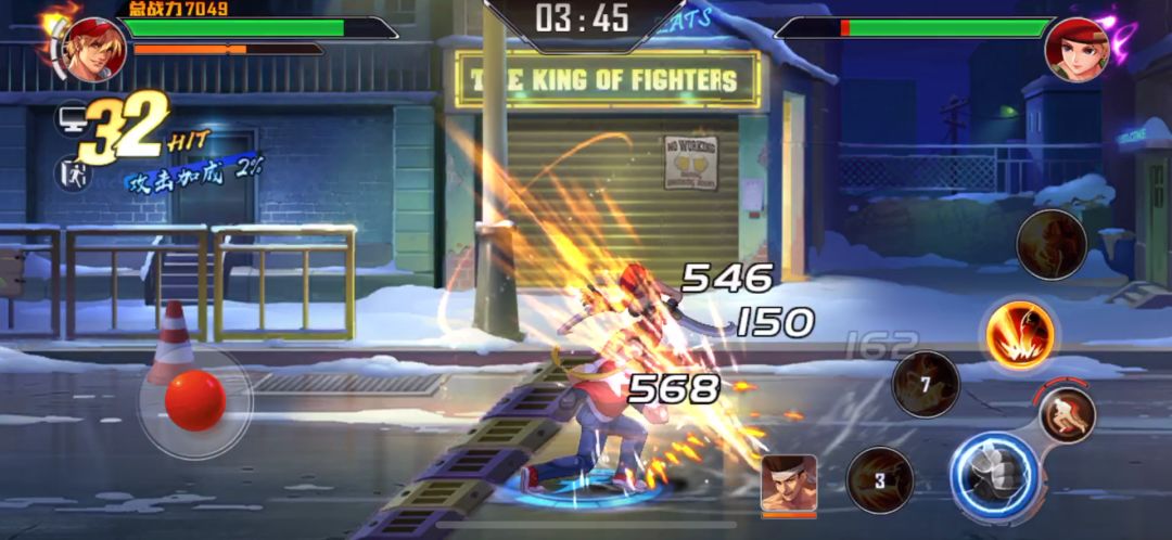 如图所示,《拳皇命运》与传统的格斗玩法模式有着明显的差异,战斗场景甚至是从经典的2D变成了2.5D。严格意义上,这应该算是一款横板动作游戏,而非拳皇系列传统的2D格斗游戏。