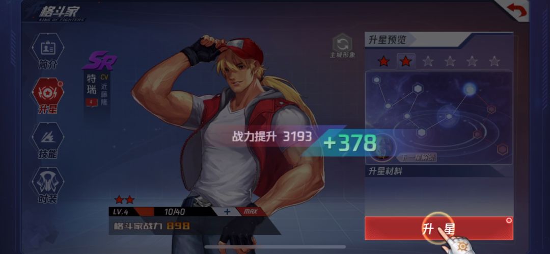 而平衡性又刚好是《拳皇命运》最容易让玩家诟病的地方,在角色界面上,“品阶、升星、技能”等熟悉的套路一个不少,甚至在新手教学中,玩家在获得角色后首要学习的课题就是“升星”。