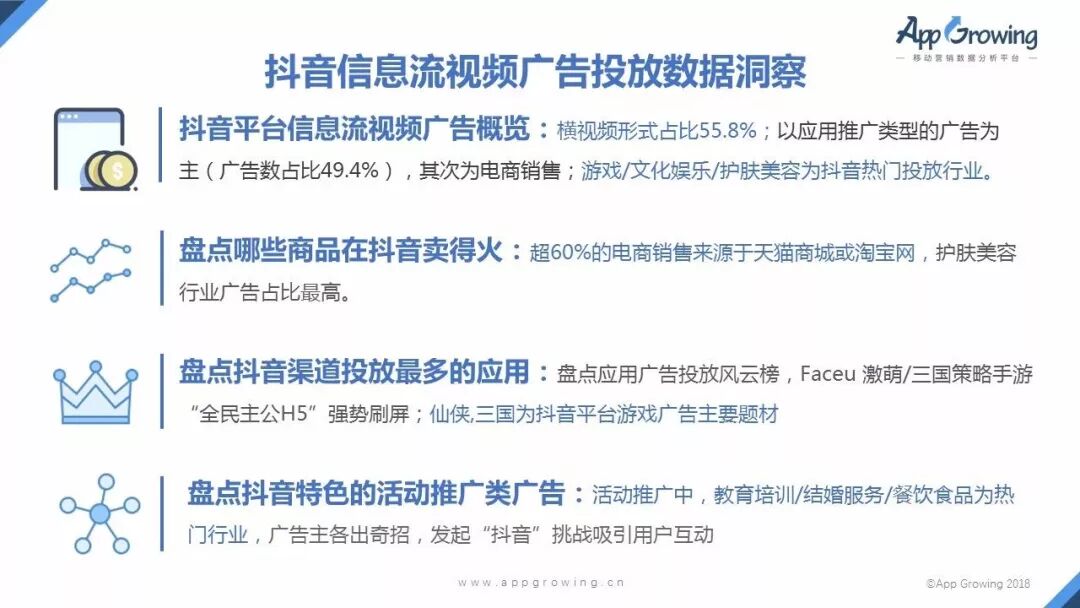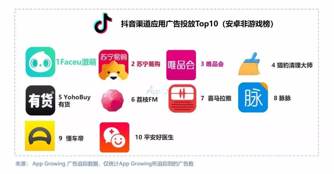 哪些行业适合投放抖音渠道?哪些商品在抖音卖得火?目前哪些广告主在抖音投放比较火?App Growing5月中旬上线抖音广告媒体渠道,作为国内首家全面追踪抖音广告的数据分析平台,App Growing以4月24日-5月14日期间所追踪到的抖音平台上的广告投放数据为依据,分析抖音信息流视频广告投放趋势。