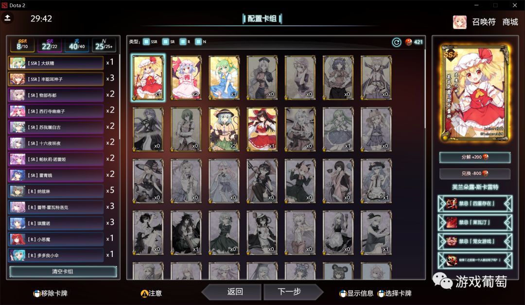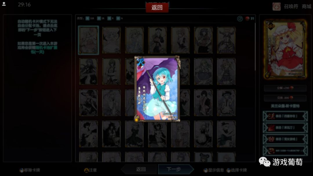 抽卡这一设计本就容易让人上瘾,东方梦符祭也不例外,换个角度来说,或许正是加入了抽卡这样的元素,让整张地图在局内玩法之外,也有了很多让人钻研的空间。游戏中的抽卡分为两个部分,一是在对局开始之前组卡阶段的抽卡,二是在对局之中进行的抽卡。