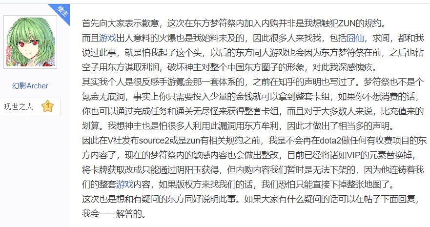 如果说东方梦符祭刚开始的内购问题只是停留在“付费时候值得”的层面,那么对于东方题材的二次创作作品来说,内购就是不可试探的底线。因此这一问题遭到了大量东方粉丝的声讨,而作者也就这一问题致歉。