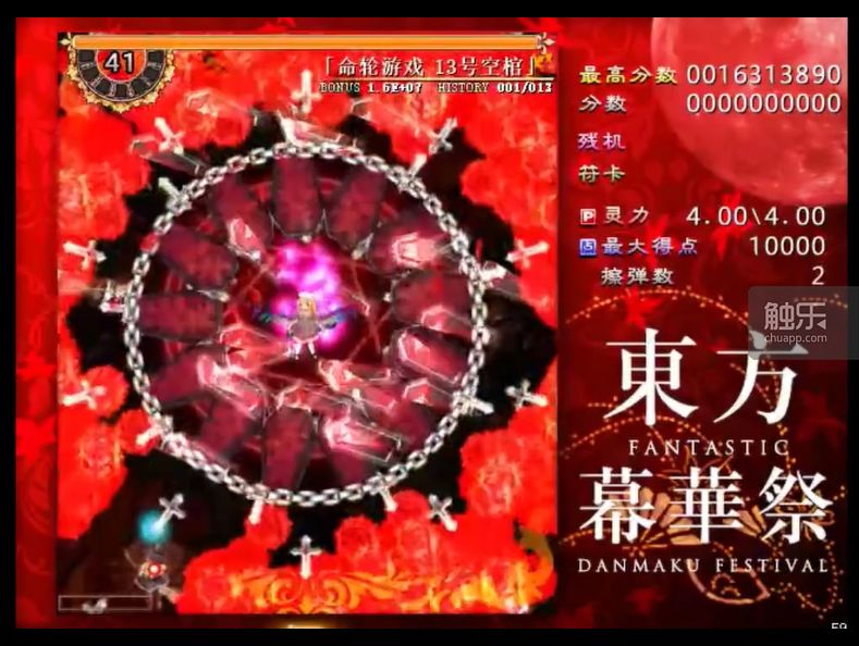 开场影片将中国“东方”同人游戏(含正在做的《东方年代记》英文版)、手书、画册、书籍等等剪辑了一番,亮了亮相,图为难度颇高的《东方幕华祭》。