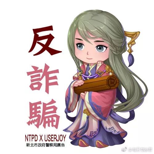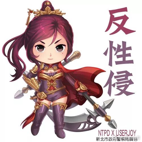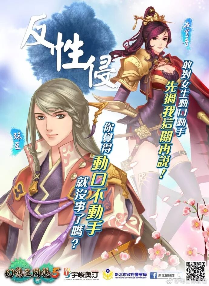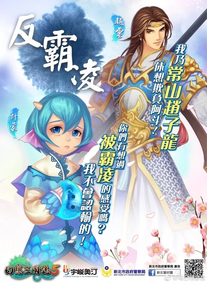 原来这是台湾新北市政府警察局与宇峻奥丁合作,以公益联名合作的方式,让生硬、严肃的警政宣导,透过「幻想三国志5」游戏主角个性化,宣传反毒、反诈欺、反霸凌、反性侵(骚扰)。