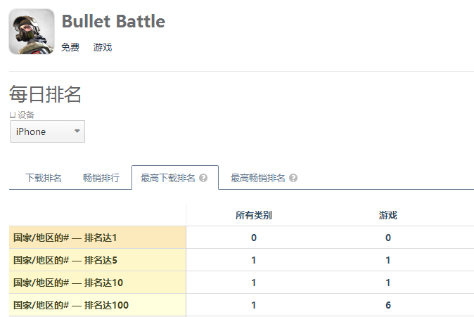 但是除了中国区iOS成绩比较突出,《Bullet Battle》在其他市场的排名并不起眼,仅拿下六个国家/地区App Store游戏免费榜TOP100。