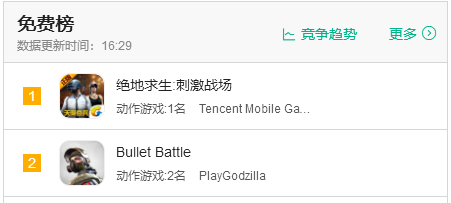 App Annie数据显示,《Bullet Battle》是开发商PlayGodzilla做的一款TPS游戏,4月11日在App Store上线,一直未进入游戏榜单,6月7日却毫无预兆冲进了iOS游戏免费榜TOP2。
