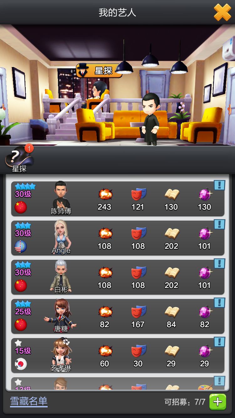 作为模拟经营游戏,发展是第一要素,而资源是发展的核心。明星系统作为《票房大卖王》影视王国最核心的资源,同时也是决定票房的核心要素之一。游戏中的每位明星都有相对应的属性设计、擅长的剧本与角色,另有神秘技能设定。明星艺人的基础属性由场面、表演、剧情、娱乐这四项构成,这四项要素对影片水平产生直接影响,达成一定条件后才能获得协会的认可。