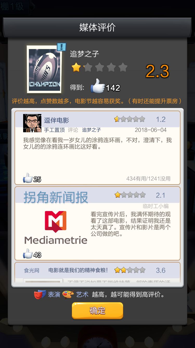 除了题材和玩法作了创新和深度打造,《票房大卖王》中有很多令人会心一笑的细节,很容易打动到一些资深电影观众,给玩家以极强的游戏现实代入感。比如影评媒体叫逗伴电影、食光网、拐角新闻报等等,影评风格犀利,神现当下的影评媒体报道。同样的某些没有拍好的电影上映后观众也会有给予热情的嘲讽,以此鞭策影视公司制作更符合观众口味的电影。