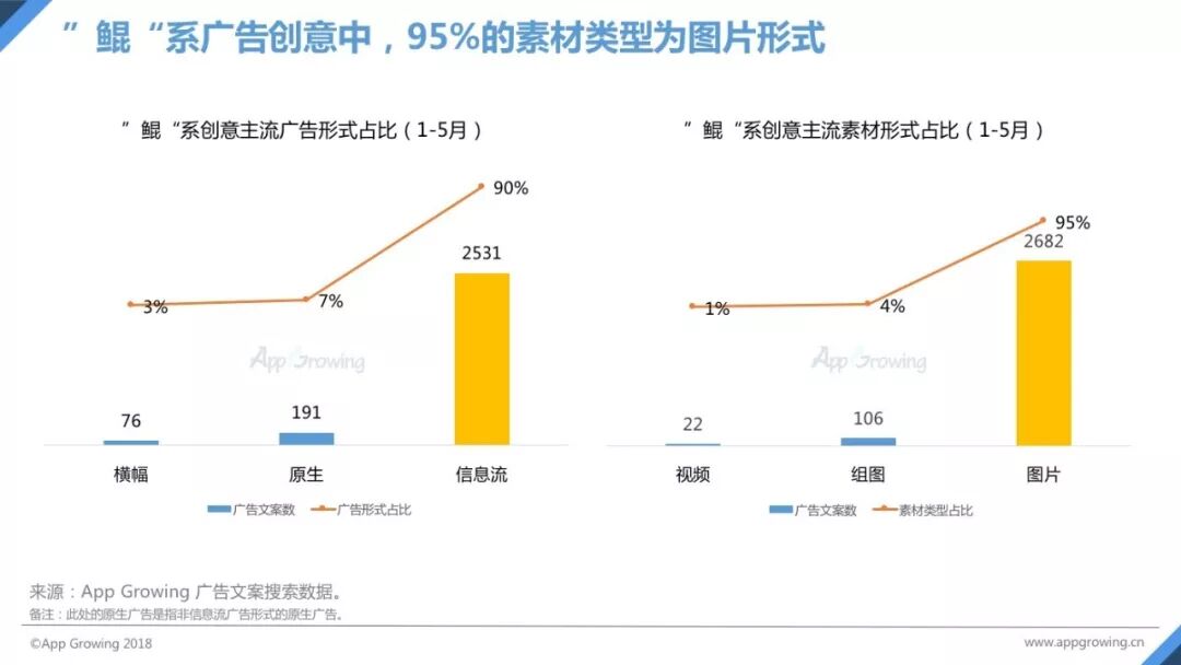另外,App Growing对目前“鲲”系素材类型进行细分与分析发现,整体而言以图片为主,占比高达95%;而组图与视频素材形式占比较少,两者占比仅约5%。