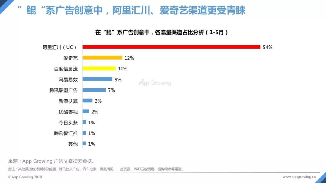 App Growing以2018年1月1日-5月30日期间所追踪到的“鲲”系广告文案数据为依据,对“鲲”系广告创意进行分析。目前,“鲲”系广告创意基本是被采用于游戏行业。接下来,App Growing主要从流量渠道、文案套路、热门文案盘点这三个方面展开分析。