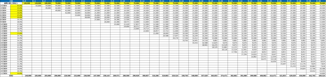 14~30日、30~60、60~90...的留存率算法一样。只不过大多数游戏的留存率越到后面对整体DAU影响越小。下面是个月度的DAU预估。