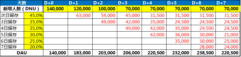 关于活跃用户(DAU),简单来说就是:当日新增用户(DNU)+当日留存老用户(DOU)。所以这里我们要预估第二个值:每日留存。留存预估经验在哪里?