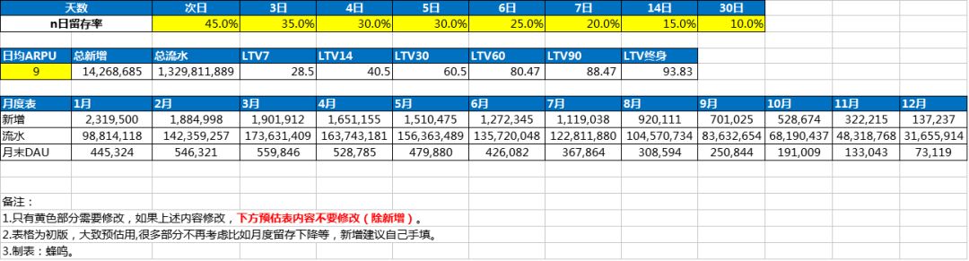 只能解释到这里了,不行就下载表格看公式吧。至此一个简单的7日的DAU预估就做完了。可能这个预估不够炫酷,那么下面就是约30日的月度预估)和约365日的年度预估。