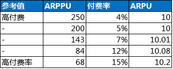 所以要想确定流水我们要预估的新值就是用户登陆贡献(ARPU),ARPU其实和留存预估类似,都曾有过神秘力量大数据支持的表格。在这里就大致说下,目前市面上的游戏,因为新增困难,优秀游戏的ARPU已经定位在8块以上,一般手游4-8块,不足4块就相对尴尬一些。但是还是那句仅供参考,因为游戏类型、DAU量级大小都会影响整体数据。下图是使用ARPPU*付费率确认的ARPU 参考。