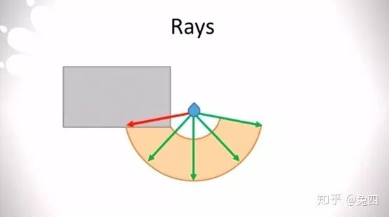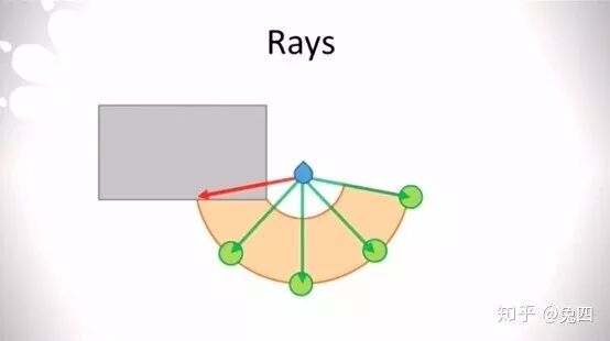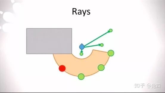 然后我们以乔尔所在的坐标点为中心,向外弧发射射线,图中这里为了表达清晰所以只显示了5根线,实际上我们在代码里用到的会更多。如果这根线在过程中碰到了障碍物,那这根线就会被删掉,我们只保留没有碰到障碍物的线,比如图中绿色的这些。