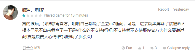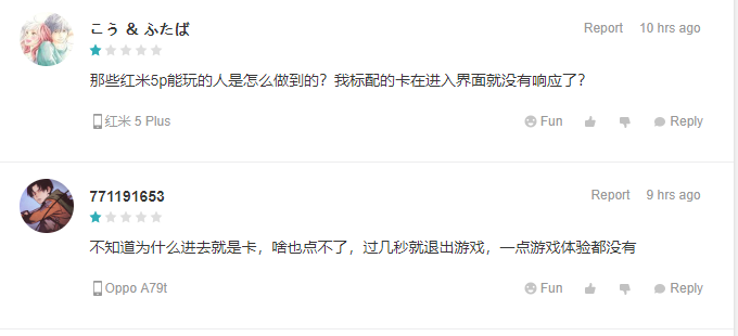 玩家的负面印象还集中在频繁的卡机和闪退上。游戏的最低配置要求与官方放出的适配机型不符,不少安卓玩家乘兴而来,败兴而归。