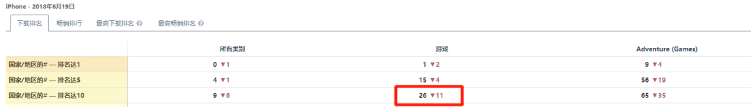 随后,方舟手游的下载量开始回落。截止6月19日,在App Store上排名Top1的市场只剩1个,而排名Top10的则下降至26个,占比下跌了48%。