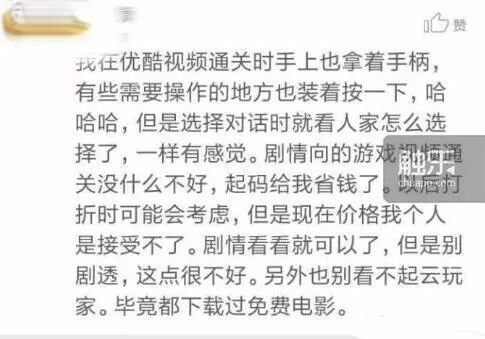 “云玩家”的前身可以追溯到“视频通关党”和“白嫖”。这两个词同样历史悠久,不太容易考证,但胜在明白准确——前者定义了手段,后者定义了态度。而它们又都具有一定程度的缺陷:“视频通关党”太长,且有点拗口;“白嫖”则不太文雅,还容易引发“难道只有花钱才是真爱”一类的讨论。