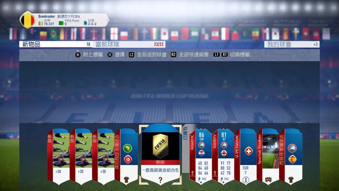 5月29日,EA Sports更新了《FIFA 18》世界杯模式DLC,世界杯模式里包含了另外一个小型FUT模式,这个模式里的球员较少,基本上只包括世界杯参赛国的卡牌球员,玩家可以利用这些球员组织自己的FUT球队挑战锦标赛,赢得世界杯。这个世界杯FUT可以理解为正常FUT模式的简化版,简化的方案目的十分明确——它取消了之前FUT里的转会市场,世界杯模式里的所有球员基本上只能靠开卡得到。如果你账号里已经没有金币了,那么只能买绿点开包,因为没有转会市场了,开出的球员还不能出售换金币,只能把不要的卡牌组合起来“献祭”,交换得到新的球员卡。