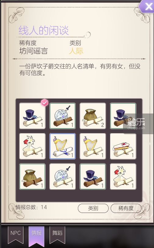 作为一个主角,我,或者说玛格达的冒险,就是在舞会上像捕捉猎物一般地搜集流言、刺探情报。每一份套来或偷听的情报都是可读的,并根据重要程度划分为几个等级,读起来有种挖掘彩蛋的快感,或会心一笑,或心生寒意。这些情报一方面帮助拓展游戏的世界观,另一方面可以用来推理暗线故事里究竟发生了什么。最重要的是,情报可以用来和NPC交换华服珠宝、提升人物好感度。将NPC的好感度提升到一定等级,就可以开启与玛格达的专属剧情线——游戏正式运营后,我打算攻略精分大魔法师泽维尔,以及萨坎家唯一的正经人巴里斯。怕就怕这个游戏目前展现出来的套路和普通乙女游戏有点不一样,传说中“大约50位可供攻略的小哥哥和小姐姐”中不但有不动春心的已婚好男人,还有两个NPC互相看对了眼儿,实在有点出乎意料……或许这是想展现“没有人能在爱情中无往不利,哪怕你是个恋爱游戏女主角”的道理吧?