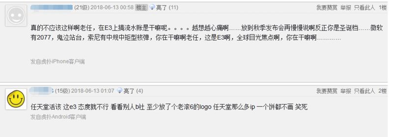 此外,将焦点放在接下来的重点产品《任天堂明星大乱斗》上本无可厚非,但超过30分钟介绍这款游戏还是令玩家有所不满。对此,有玩家表示,“任天堂那么多IP,却一个饼都不画”。