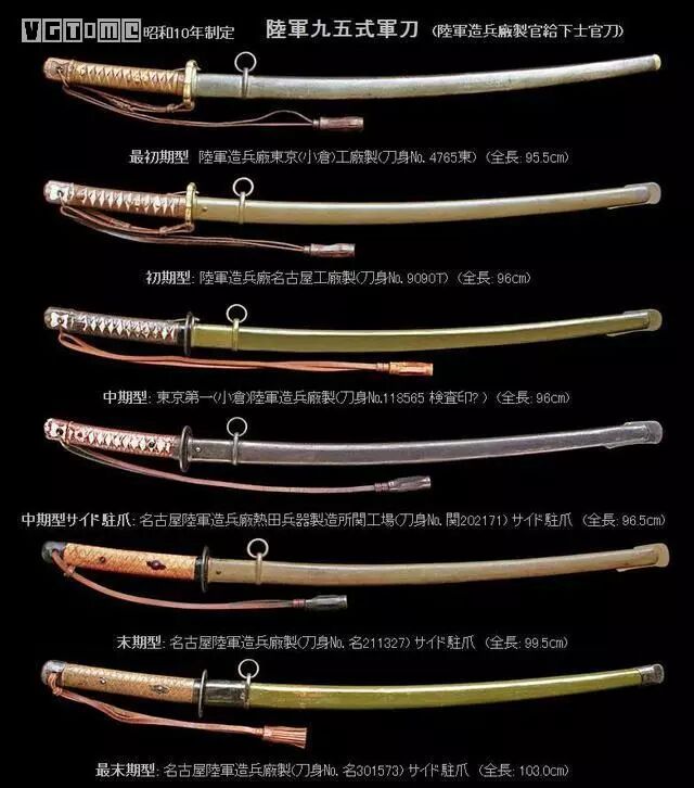 至于日本刀我们就更熟悉了,随手找一部抗战片都能发现佩戴军刀的日本官兵,它可以视为指挥器具和一种身份象征。较早的94式军刀包含26个零部件和装饰,面向的阶层正是中高级军官。之后也出现了机械批量生产的95式士官刀,以及94式军刀的“精简版”98式军刀,它们的配给对象则是曹长和尉官。